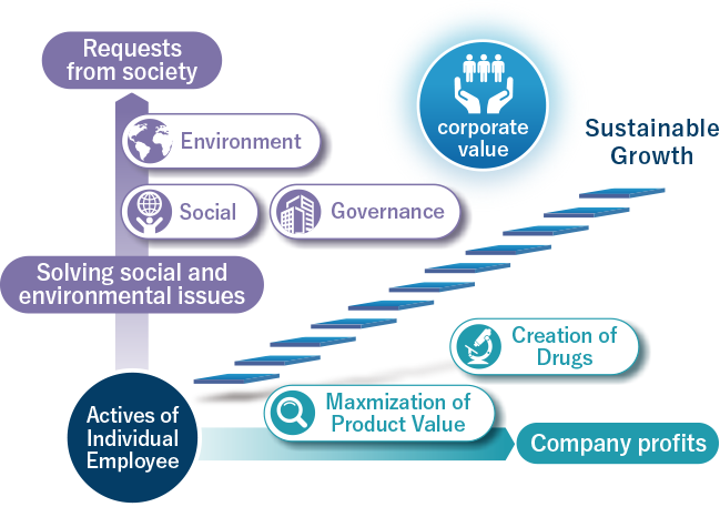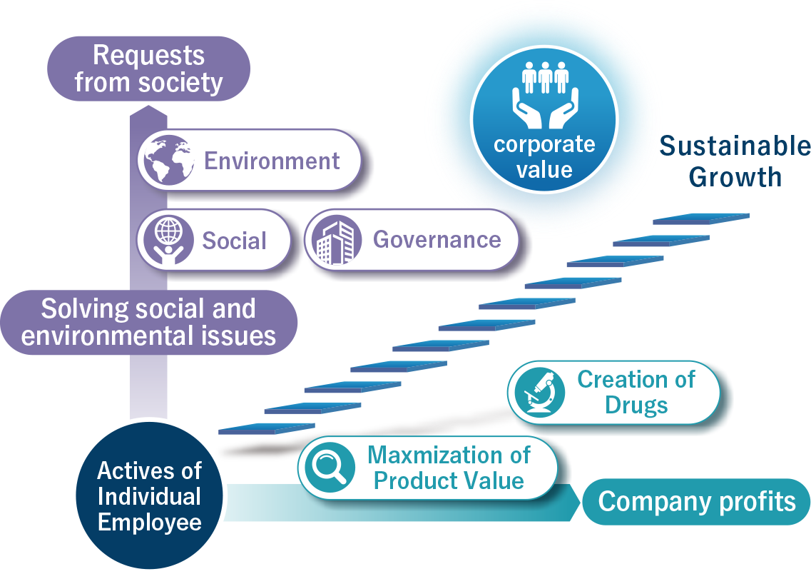 Our aim is for the company to grow and continue giving back to society through the creation of new drugs and by addressing environmental and social issues. By doing that, both the company and society can continue to grow together. This is Ono Pharma's approach to sustainability.
