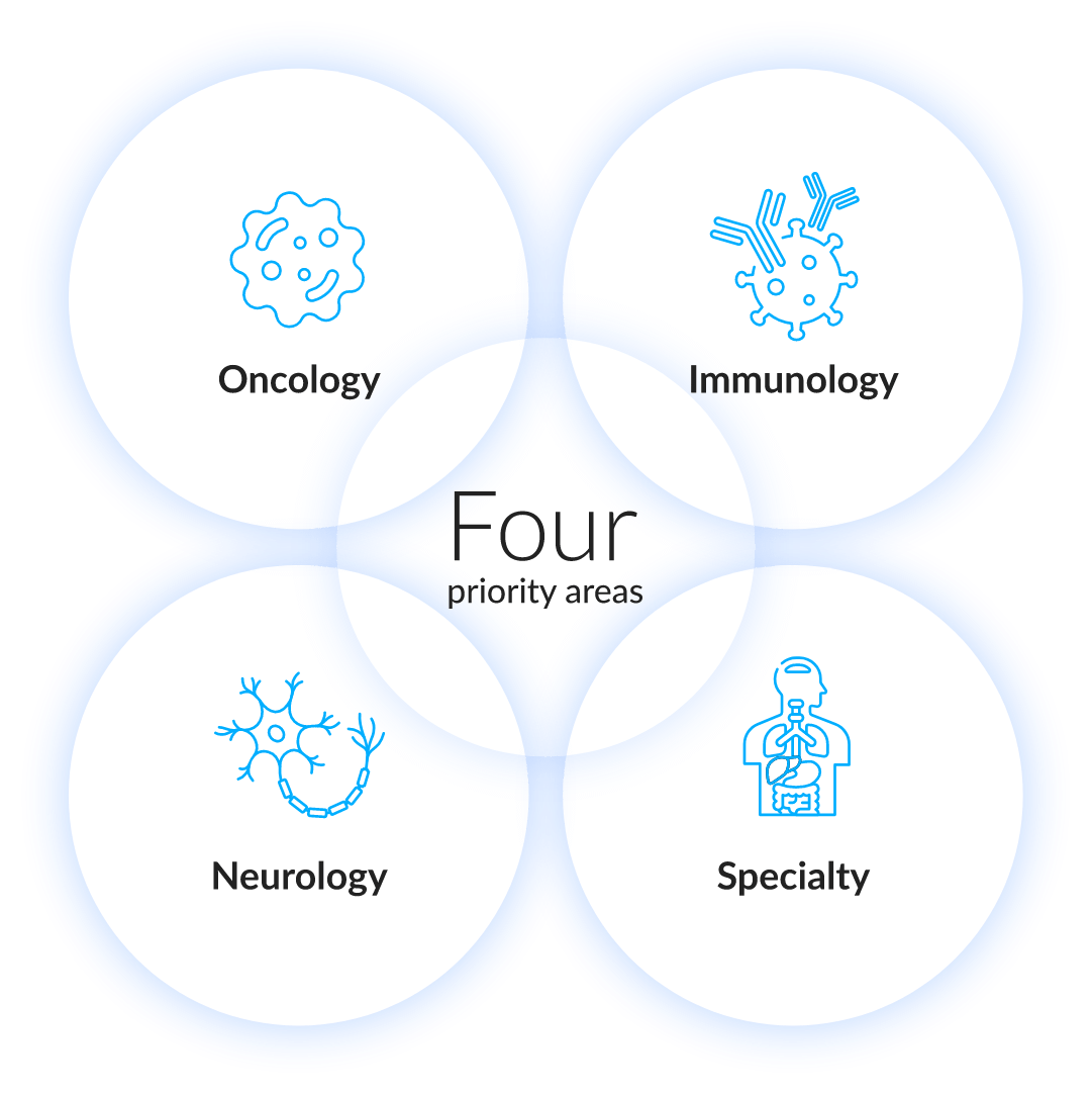 Under the drug discovery strategy of “creating unique and innovative new drugs,” we advance research and development focused on oncology, immunology, neurology, and specialty, which are each areas where there is a high level of medical need but limited treatments. We will accumulate and utilize disease know-how, aiming to create innovative drugs in response to the hopes of patients.