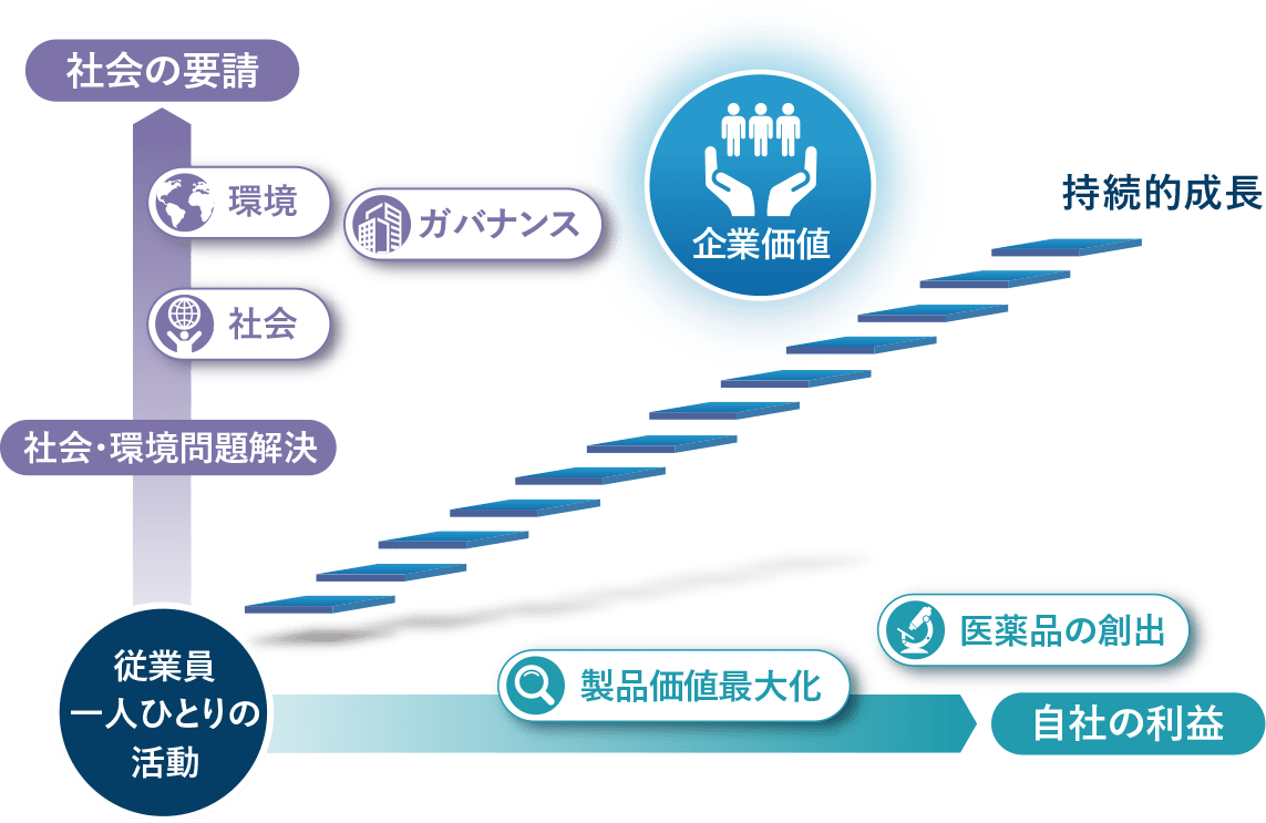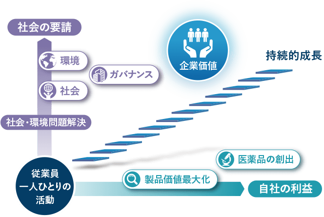 辻田 サステナビリティ(Sustainability)とは、「sustain(持続する)」と「able(できる)」が組み合わされた言葉で、「持続可能性」を意味します。企業と社会が持続的に発展するために、企業は利益だけを追求するのではなく、物事の長期的な影響を考え、社会的責任を果たすことが期待されています。下図に示すように、「社会からの要請」と「自社の利益」が両立していることが大切ですが、当社の本業である「新薬を患者さんにお届けすること(医薬品の創出)」はサステナビリティの根幹と考えています。当社が成長し、その利益を、新薬の創出や、環境・社会課題の解決などのかたちで、社会に還元し続けること、企業と社会が一緒に成長し続けること。これが、小野薬品が目指すサステナビリティの考え方です。