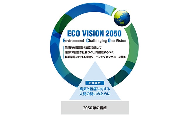 中井 ESGのE(環境)に関しては、当社の強みであり、2019年に策定した中長期環境ビジョン「Environment Challenging Ono Vision 2050(ECO VISION 2050)」のもと、「脱炭素社会の実現」、「水循環社会の実現」および「資源循環社会の実現」の3つを重点項目と定め、製薬業界における「環境リーディングカンパニー」を目指しています。ECO VISION 2050においては、2035年までに温室効果ガス排出量ゼロ、2025年までに購入電力に占める再生可能エネルギー比率100%など、具体的かつ厳しいゴールを設定しています。2024年度における購入電力に占める再生可能エネルギー比率は93.2%であり、目標である100%に向けて、現在は自社ビルのみならずテナントビルでの再生可能エネルギーの利用に向けて取り組みを強化しています。全社の取り組み意識はとても高く、毎月実施している環境に関する分科会においては、各工場や研究所の担当者から現地ならではのアイデア・提案がなされる活発な状況になっており、一体感を持って取り組んでいると実感しています。